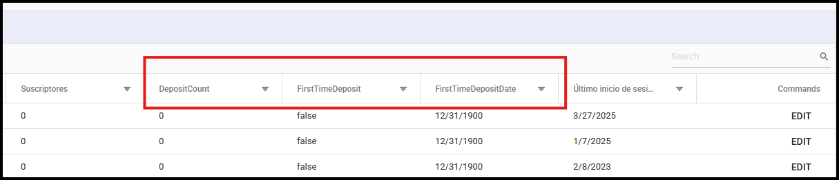 Si te desplazas hasta la extrema derecha de la tabla, encontrarás las columnas Deposit Count, que indica cuántos depósitos ha registrado; First Time Deposit, que indica si ya ha hecho un primer depósito; y First Time Deposit Date que indica cuando fue su primer depósito.