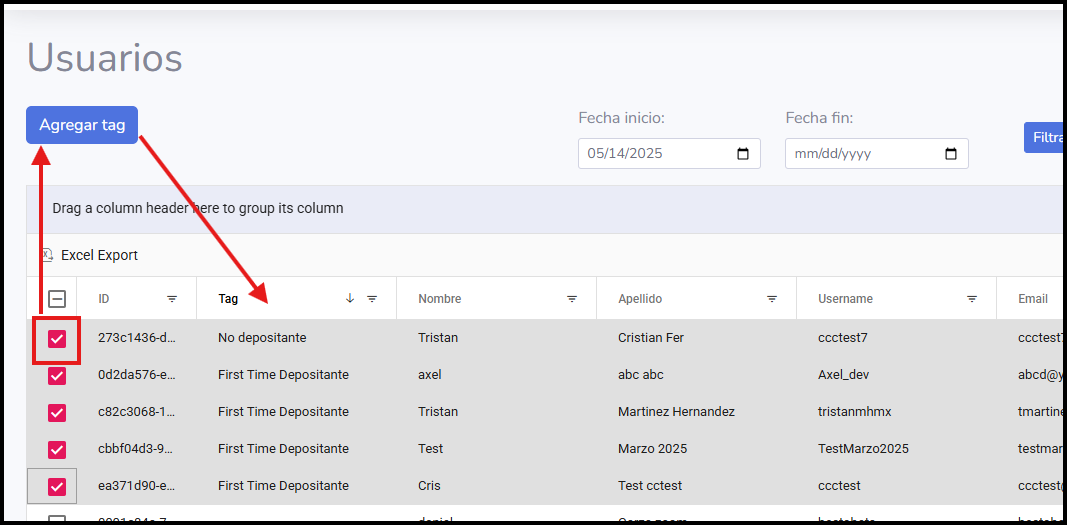 No aparece el botón "Agregar Tag": Asegúrate de haber seleccionado al menos un usuario marcando su casilla en la tabla o refresca la página.