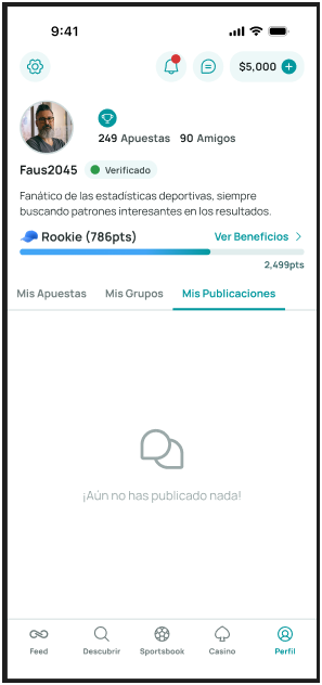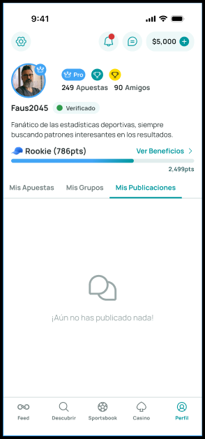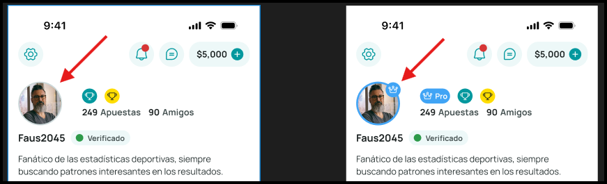 Los usuarios que no se registran como tipsters no cuentan con ningún distintivo visual en su avatar. En las mismas secciones mencionadas anteriormente (feed, descubrir, resultados de búsqueda y perfil), su presencia se muestra sin contorno azul y sin etiqueta “Pro”.