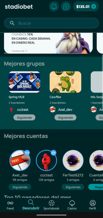 En las categorías dentro de Descubrir, como por ejemplo “Mejores Cuentas”, los tipsters profesionales aparecen con los mismos distintivos: