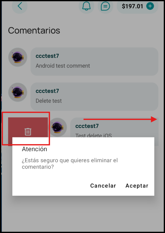 Desliza el comentario hacia la derecha. Esto revelará un botón de "Eliminar".
