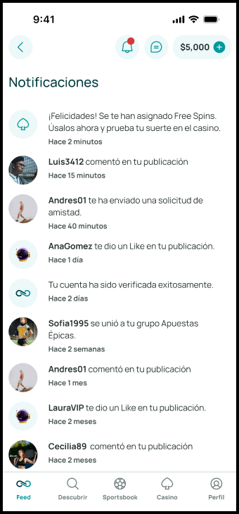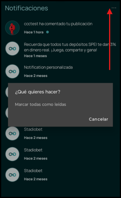 El panel de notificaciones te permite estar al tanto de todas las interacciones importantes que ocurren dentro de la app. Ya sea que recibas un like, un comentario, o que el equipo de Stadiobet te envíe un mensaje, aquí podrás consultarlo todo de forma centralizada y ordenada.