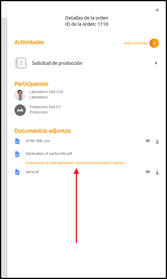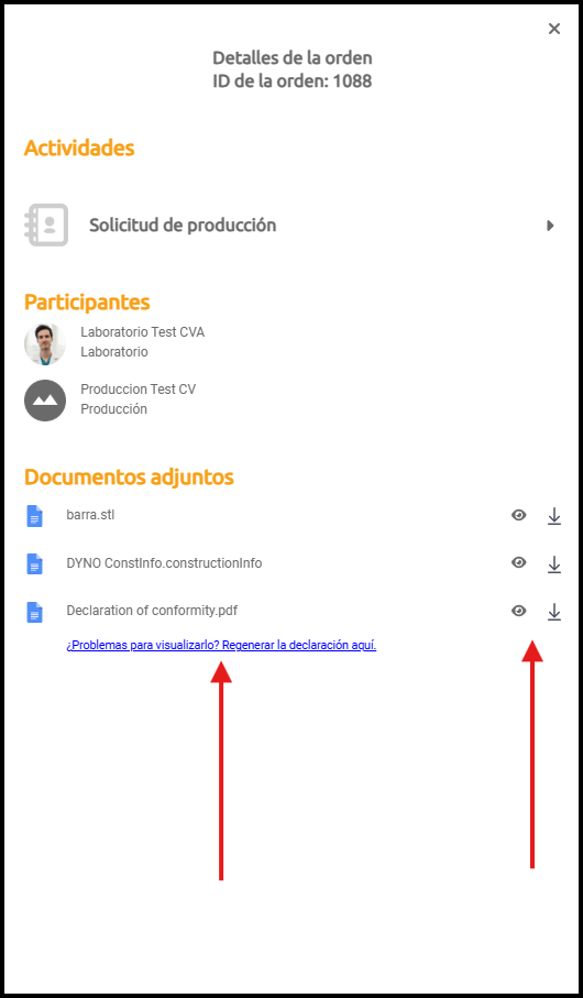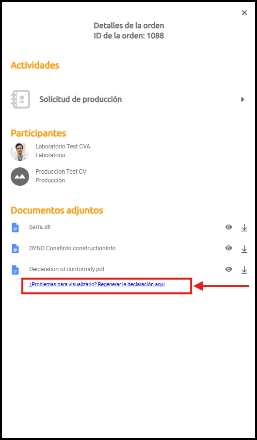 Dynomic cuenta con un sistema automatizado para generar Declaraciones de Conformidad al marcar una orden como finalizada. Esta funcionalidad está disponible tanto para el rol de laboratorio como para el rol de producción, y tiene como objetivo evitar retrasos o fallos en la generación de documentos, permitiendo además la opción de regenerarlos cuando sea necesario.