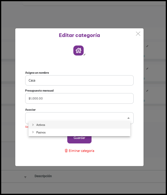La sección Presupuesto permite al usuario administrar sus ingresos y gastos de manera clara, estableciendo límites y asociando movimientos a categorías y cuentas específicas. Esta funcionalidad está disponible para usuarios con suscripción activa.