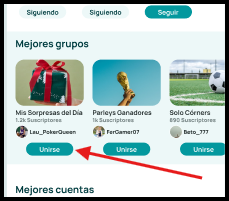 En esta área encontrarás una lista de grupos destacados, visibles con su imagen, título y un botón de acción.