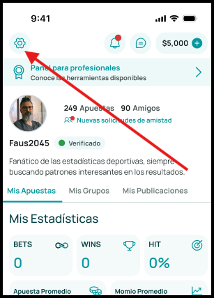 Dentro de tu perfil, selecciona el icono de ajustes ubicado en la parte superior izquierda.
