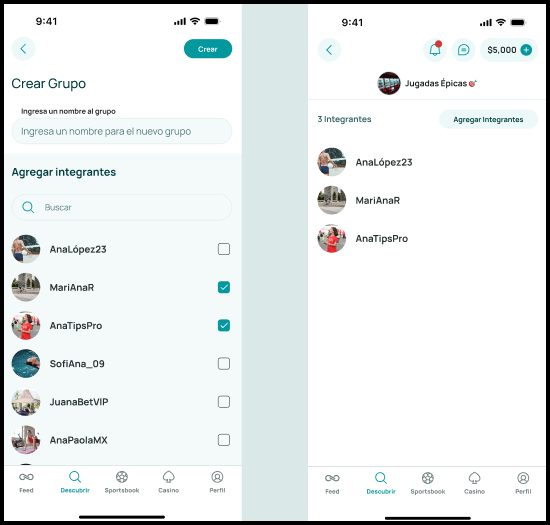 Ingresa un nombre para el grupo y selecciona los participantes usando las casillas de verificación.