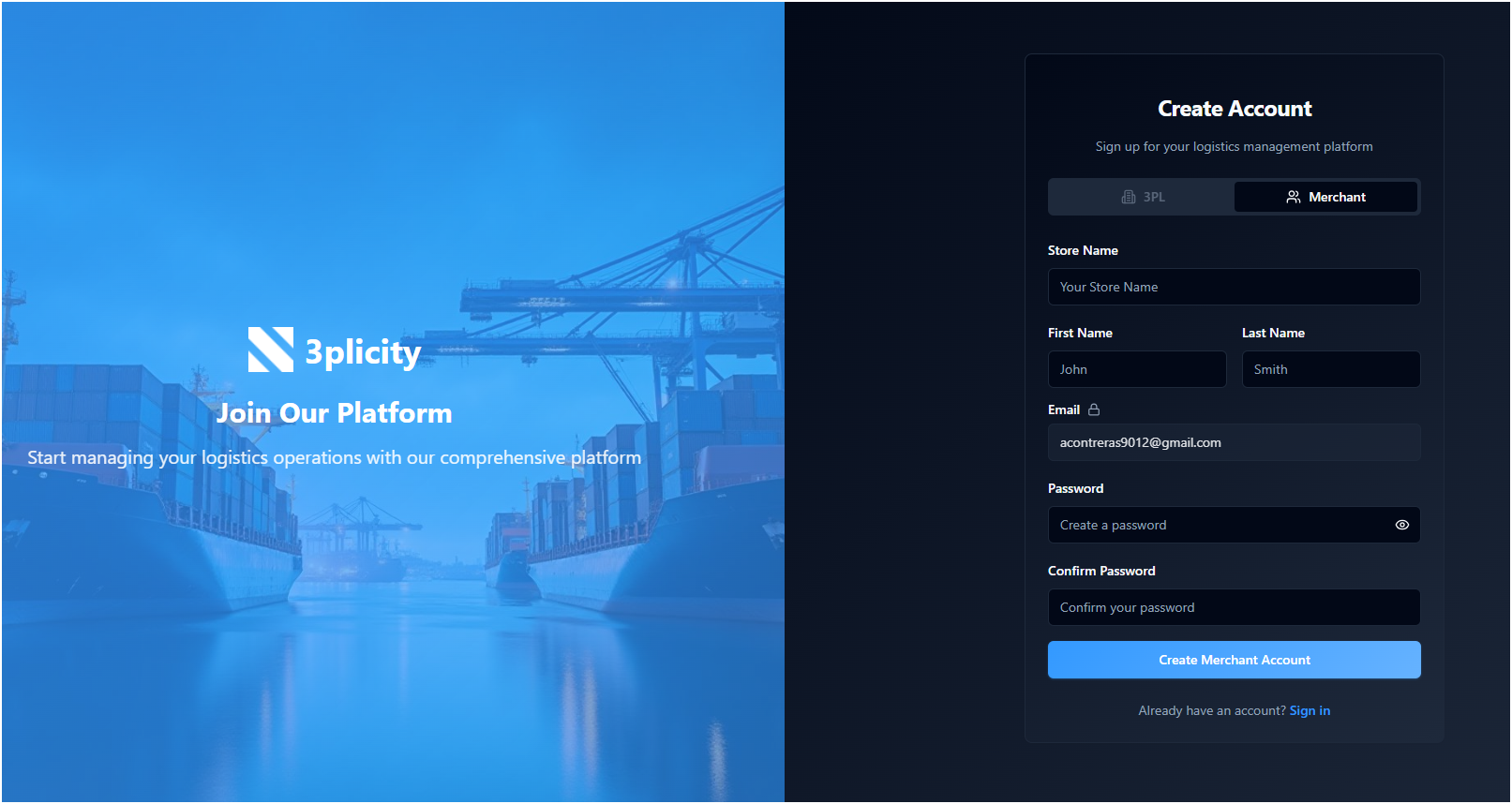 In 3PLICITY, Merchant accounts are created through an invitation sent by a Company (3PL). This ensures that all merchants are securely linked to the company that invited them.